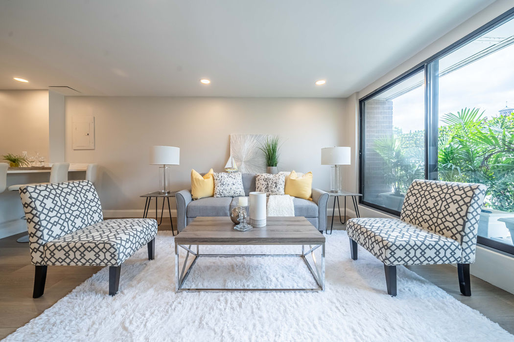 The unit’s inviting floor plan welcomes you with its open concept living room, dining room, and beautifully renovated kitchen. The kitchen is a chef’s dream, featuring a breakfast bar, stainless steel appliances including the induction cooktop with vent hood, sleek quartz countertops, and recessed lighting.