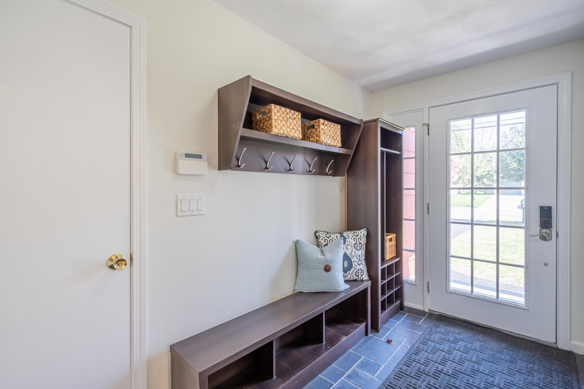 The mudroom provides a gradual entry into the home, connecting easily with both the front door and garage, while offering ample storage for shoes and outdoor gear.