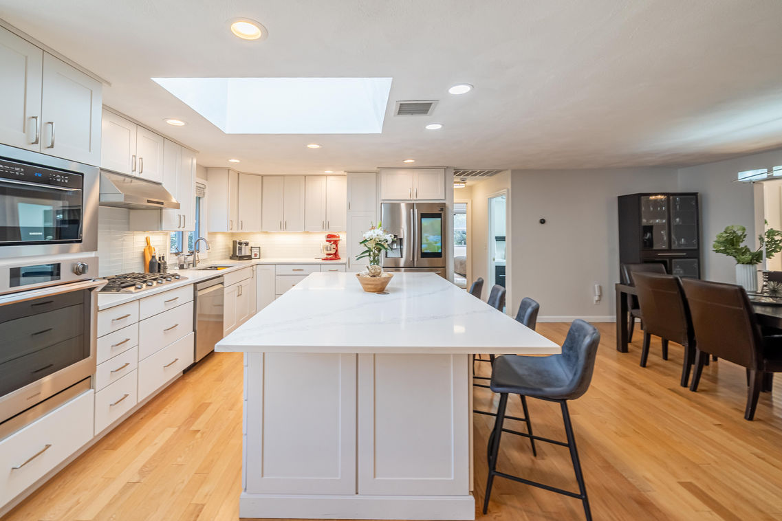 The moment you step beyond the foyer, you will know this home is “the one” as the main level introduces an open concept floor plan seamlessly connecting the updated kitchen, dining room, and living room beyond. The beautifully renovated, open concept kitchen is a chef’s dream, combining both functionality and style. You will love the large breakfast bar island, premium stainless-steel appliances including the gas cooktop, and quartz countertops. A large skylight and bay window flood the space with natural light while sleek white cabinetry provides plenty of storage for all your culinary supplies. The current owners have incorporated many ‘smart home’ updates to easily control lights and appliances via an app, including the refrigerator which allows you to view its contents remotely.