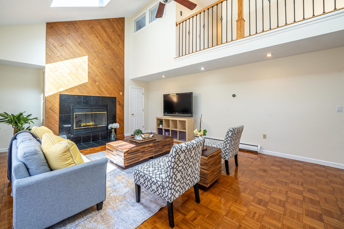 Spacious Family Room with Fireplace and Vaulted Ceiling