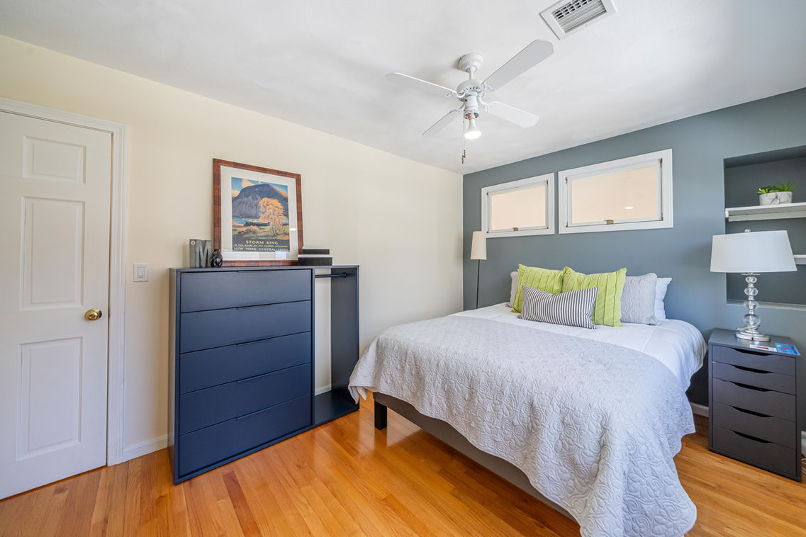 The main level offers two more family bedrooms and an additional full bathroom. One of the bedrooms is equipped with a Murphy bed, offering the flexibility to accommodate guests and easily convert the space for other uses afterward. The other bedroom offers great potential to use as an office, if desired. Both bedrooms are conveniently located near the full bathroom, which includes a modern vanity and a tub with a shower. The laundry room adds the finishing touch to the main level.